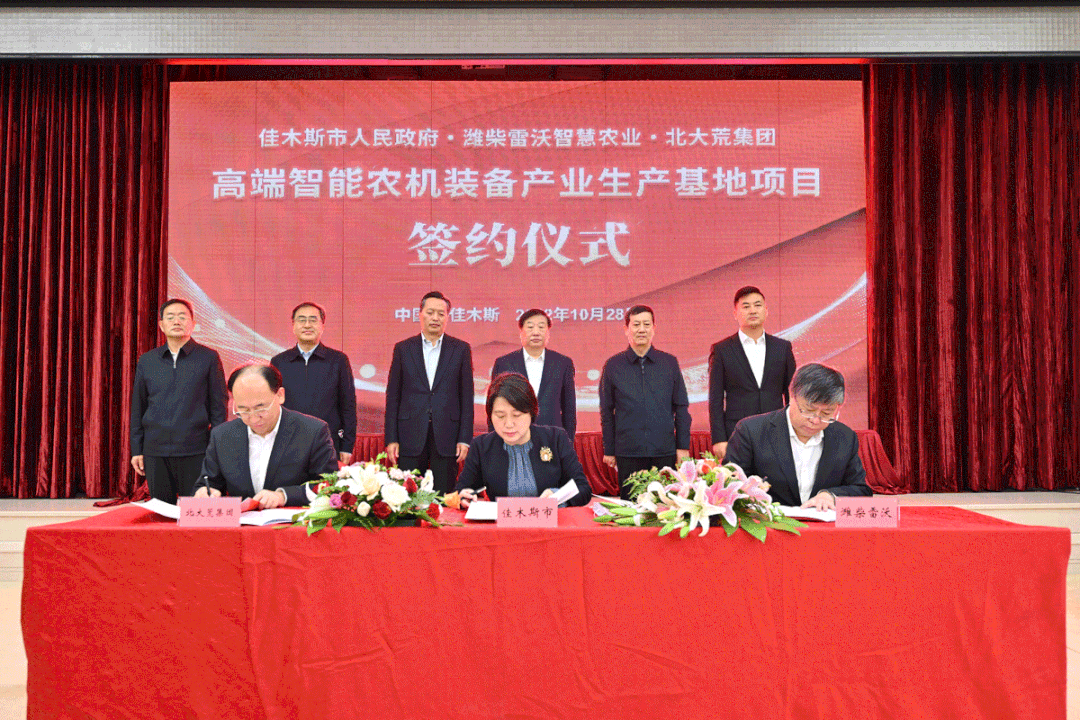 10月28日上午8:00,潍柴雷沃智慧农业在佳木斯市与北大荒农垦集团举行高端智能农机装备项目签约活动。黑龙江省、佳木斯市、北大荒农垦集团、潍柴雷沃智慧农业等相关领导参加签约活动。