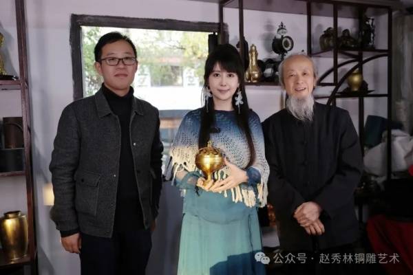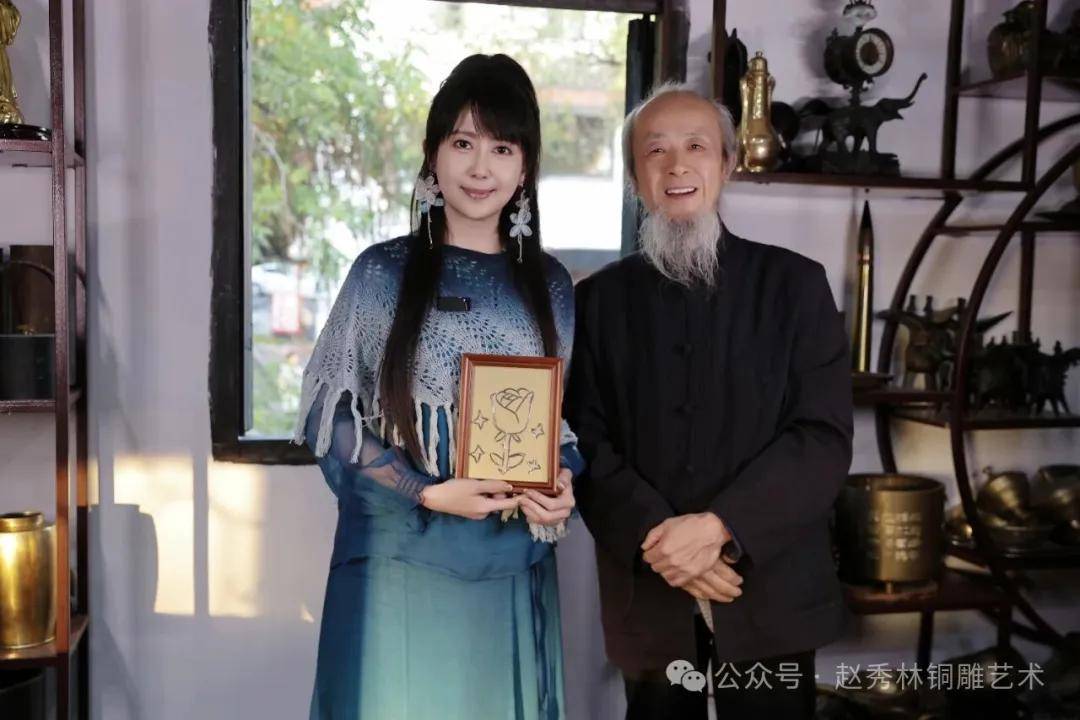 近日,中国台湾知名歌手孟庭苇专程到访绍兴赵家铜艺作坊,与浙江省非物质文化遗产“绍兴铜雕”代表性传承人赵秀林老师展开了一场别开生面的艺术对话。在赵老师的亲自指导下,孟庭苇沉浸于铜雕技艺的魅力之中,亲手完成了一件以她经典代表作《羞答答的玫瑰静悄悄的开》为主题的铜雕作品,为此次文化交流留下了独特的纪念。