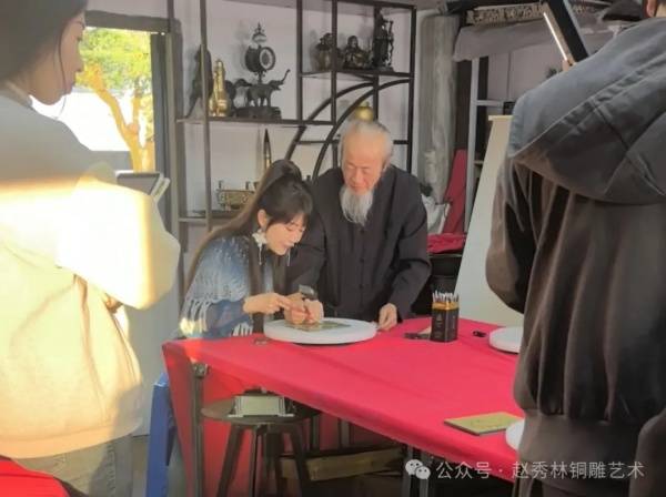年逾七旬的赵秀林老师,是绍兴铜雕的领军人物,从艺已逾五十载。他不仅精通凿、刻、镂、锻、铸等全套铜雕技艺,更开创性地融合书法、绘画与金石韵味于铜雕创作之中,使冰冷的铜器焕发出文人雅趣与生命温度。赵老师向孟庭苇细致讲解了绍兴铜雕的历史渊源与工艺精髓,并亲自示范如何运刀、如何把握力度,将笔触的抑扬顿挫转化为金属上的永久刻痕。