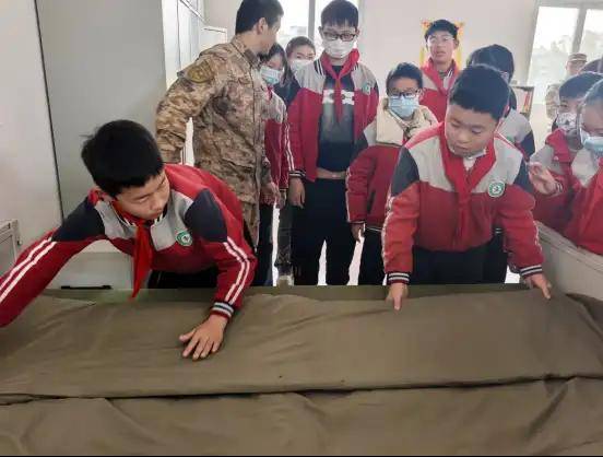 在官兵带领下,学生们走进军营荣誉室,循着历史脉络重温部队发展历程与英雄事迹,沉浸式感受国防力量的厚重底蕴与使命担当。军营实践中,军营故事分享环节,官兵代表结合日常训练与装备实操,讲述军旅生涯中的成长与坚守。同学们兴奋地拿起各种枪支,感受它的力量和技术的创新。他们还参观了军人内务整理。棱角分明的“豆腐块”被子、整齐划一的生活用品、一尘不染的宿舍环境,让大家纷纷赞叹。军人叔叔现场演示折叠技巧,详解内务整理背后“严谨细致、令行禁止”的优良作风,同学们纷纷学着叠“豆腐块”被子,体验了军人生活的严谨和自律。他们深受触动,立志将这份自律融入日常学习生活。同学们来到军事武器展示区,坦克、装甲车、各类枪械等装备整齐列阵,极具视觉冲击力。在军人讲解员的专业介绍下,同学们了解了武器性能、用途及国防建设历程,好奇地追问操作原理与安全知识。触摸着冰冷的装备,聆听着保家卫国的故事,民族自豪感与爱国热情油然而生。