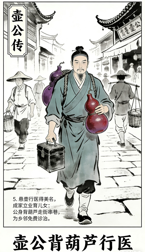 壶公看病不分贫富,有求必应。遇贫苦之人求医,不仅免费诊治,临行还赠予干粮。因其医术高超,药到病除,壶公之名远播百里,后传遍四方,渐成通称。