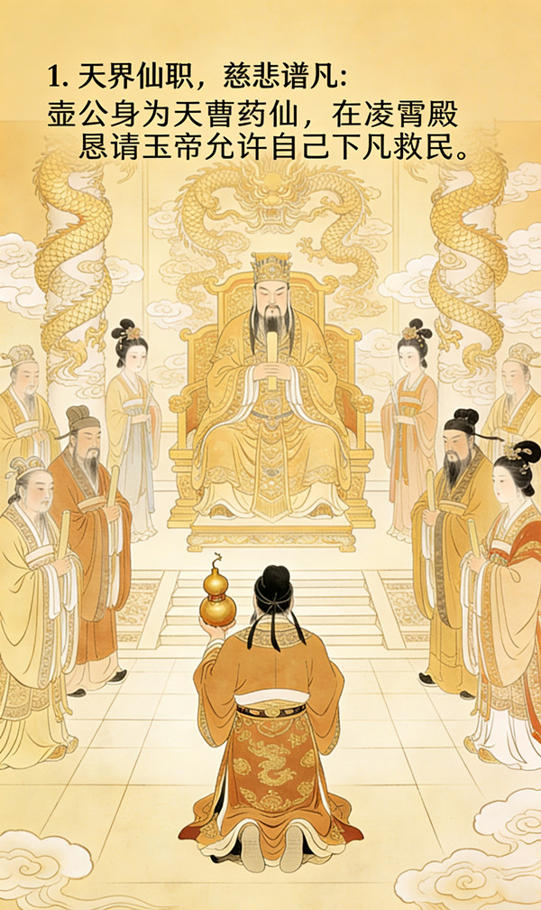 一日,壶公于凌霄殿奏事,将凡间疾苦之状呈于天镜,泪洒仙袍,叩请玉帝:“臣愿下凡历劫,以一身仙术、半世仁心,救民于病苦,积功累德,待功成之日,复归仙班。”