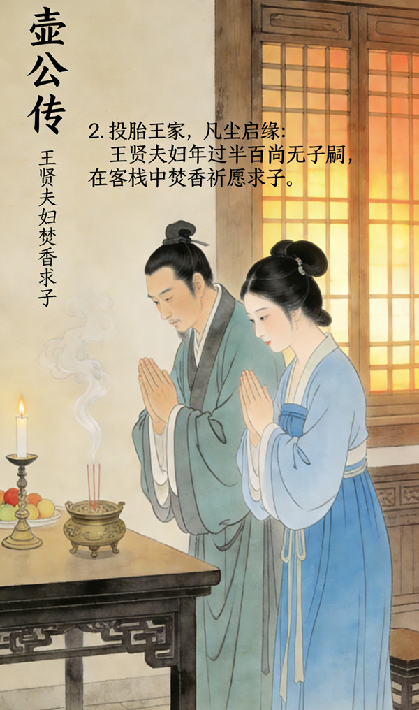壶公择此善门投胎,正值王贤夫妇诚心祈愿之日。是日正月十五元宵佳节,月圆人和,客栈清静。一觉醒来,妇人忽觉身有异兆,忆及昨夜喜梦:见一背负葫芦的郎中,自葫芦中取出丹药,言服之可得贵子。妇人欢喜,当即吞服。虽身有微恙,夫妇二人皆以为吉兆,复又焚香祈福,但愿梦想成真。